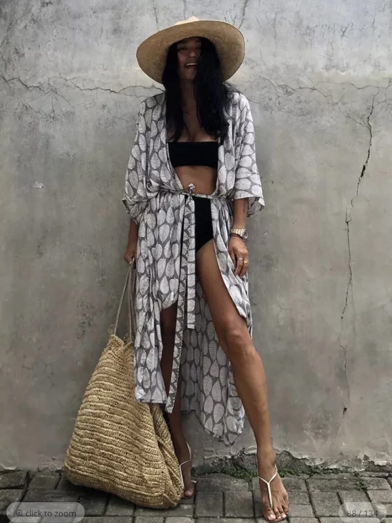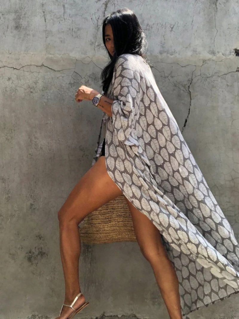 Elegant taupe kimono with soft leaf print and a relaxed, flowing silhouette for effortless beach layering.