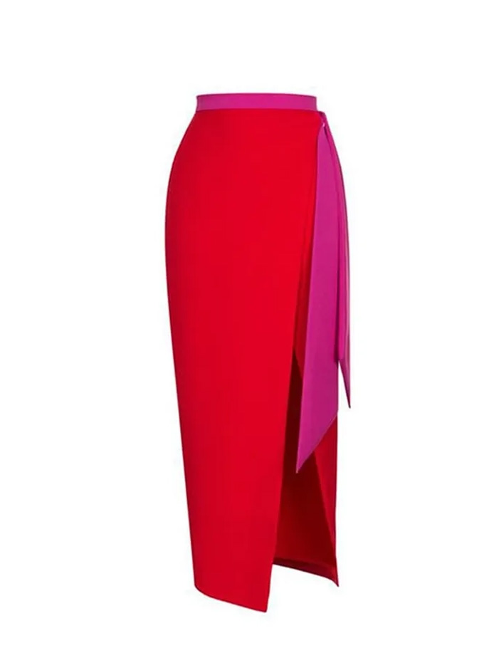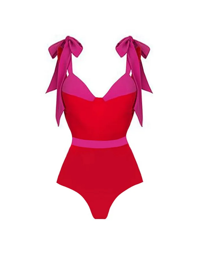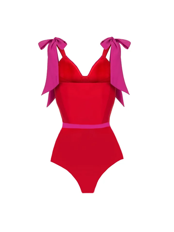 A bold red one-piece with pink bow straps, paired with a sleek matching skirt for refined summer glamour.