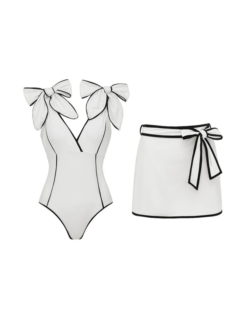Refined one-piece swimsuit featuring elegant bow straps and black contrast piping, paired with a coordinating wrap mini skirt for a sophisticated resort look.