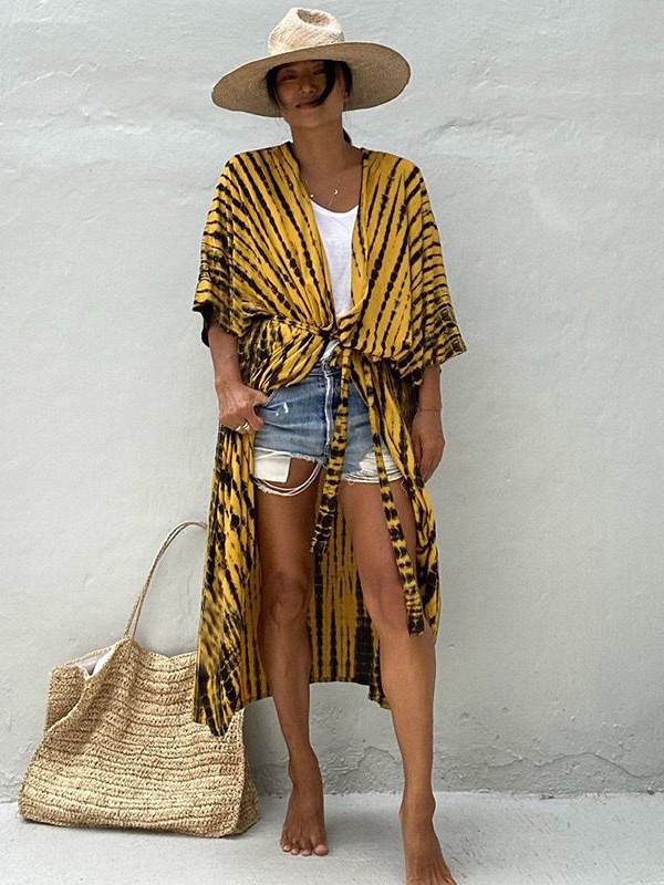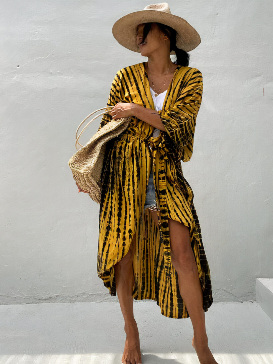 Bold yellow tie-dye kimono with graphic lines and a relaxed, flowing silhouette.